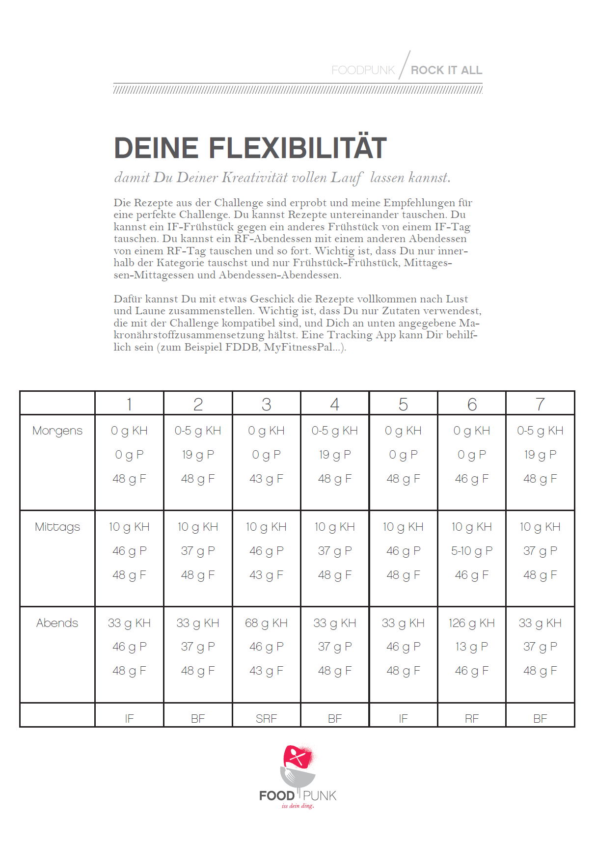 Wichtiger Hinweis: Die Rock It All ist aktuell aufgrund der täglich wechselnden Makronährstoffkombinationen nicht in der Foodpunk App verfügbar. Die Rezepte aus dieser Challenge sind vorwiegend nicht in der Foodpunk App verfügbar. Die Challenge ist für Fortgeschrittene und bedarf viel Planung und Genauigkeit.